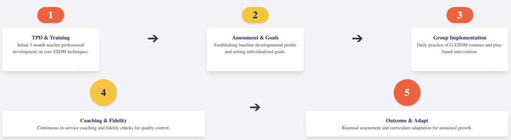 This flow chart suggests the five essential steps ensuring fidelity and teacher capacity building for the implementation of the Group-based Early Start Denver Model.