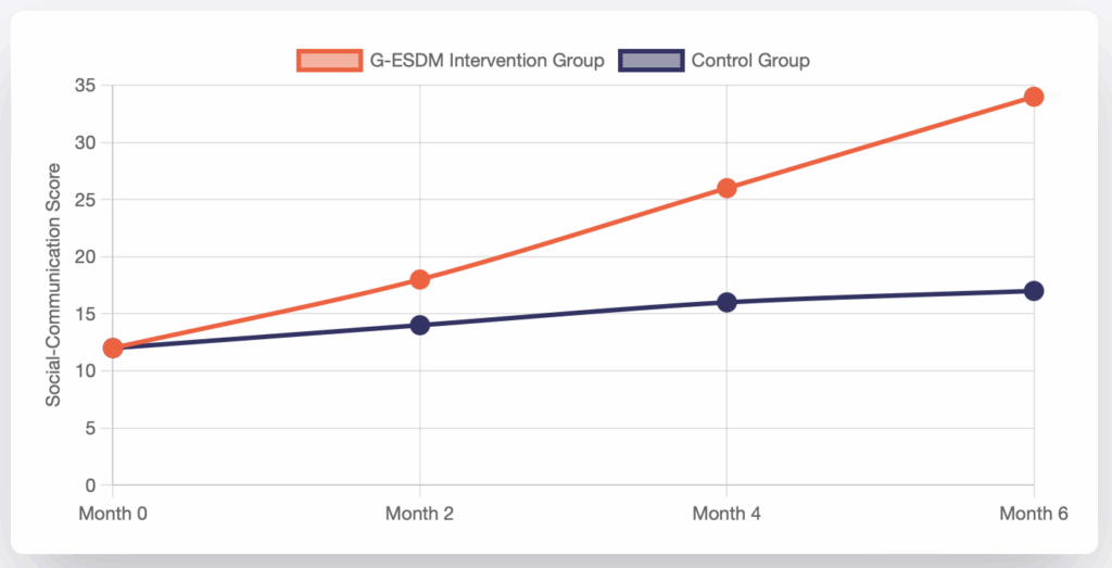 The Line Chart above illustrates the significant difference in skill acquisition over six months between the intervention group (receiving G-ESDM) and the control group, highlighting the model’s evidence-based efficacy in a group setting.